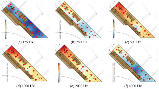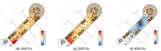 Spatial distributions of T30 in Pier B for six octave bands: (a) 125 Hz, (b) 250 Hz, (c) 500 Hz, (d) 1000 Hz, (e) 2000 Hz, and (f) 4000 Hz.