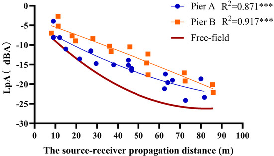 To further verify the differences between these two attenuation curves and eliminate the influence of measurement distance, an ANCOVA was conducted with “distance from the sound source” as the covariate. After controlling for distance, the difference in sound pressure levels between Pier A and Pier B remained statistically significant (p < 0.001), indicating a genuine discrepancy in their attenuation characteristics. According to the first-order term (B1) of the quadratic polynomial regression model, free-field conditions exhibit the fastest attenuation (−0.5398), with Pier A (−0.3081) between the free field and Pier B (−0.1868). This implies that Pier A attenuates sound more rapidly than Pier B. The second-order term (B2) further indicates that Pier A may continue to increase its attenuation rate in the far-field region (B2 = 0.00121), while Pier B’s attenuation slows slightly at greater distances (B2 = −0.000212).