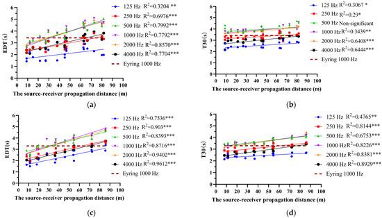Graphs illustrating the variation in 125–4000 Hz EDT and T30 with distance from the sound source at each receiving point in Pier A and Pier B. (*: p < 0.05, **: p < 0.01, ***: p < 0.001). (a) The dependence of EDT on propagation distance in Pier A; (b) The dependence of T30 on propagation distance in Pier A; (c) The dependence of EDT on propagation distance in Pier B; (d) The dependence of T30 on propagation distance in Pier B.