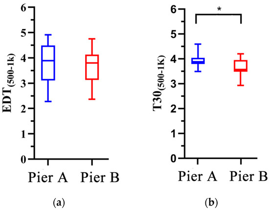 Comparison of EDT(500–1k) and T30(500–1k) averages in Pier A and Pier B. (*: p < 0.05). (a) Comparison of EDT(500–1k) in Pier A and Pier B. (b) Comparison of T30(500–1k) in Pier A and Pier B.