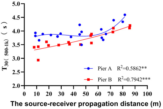 Graphs illustrating the variation in T30(500–1k) with distance from the sound source at each receiving point in Pier A and Pier B. (**: p < 0.01, ***: p < 0.001).