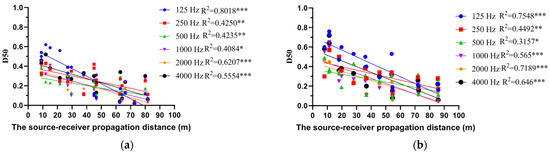 Graphs illustrating the variation in 125–4000 Hz D50 with distance from the sound source at each receiving point in Pier A and Pier B. (*: p < 0.05, **: p < 0.01, ***: p < 0.001). (a) The dependence of D50 on propagation distance in Pier A. (b) The dependence of D50 on propagation distance in Pier B.