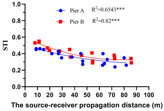 Graphs illustrating the variation in STI with distance from the sound source at each receiving point in Pier A and Pier B. (***: p < 0.001).
