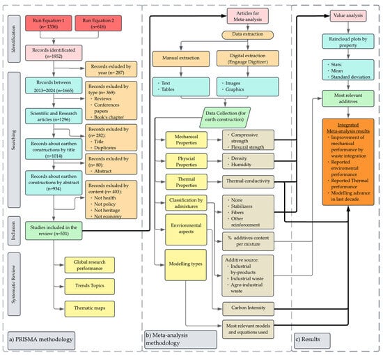 This manuscript is organized into four sections. Section 2 describes the research methodology, including the tools and methods used for data processing. In Section 3, a systematic review is first conducted to identify the main trends and relevant issues in earth construction research during the last decade and their increasing importance globally. Then, a comprehensive review of the environmental performance of these constructions is offered, highlighting the aspects evaluated in terms of sustainability and the use of additives from industry and agribusiness to improve their properties. A meta-analysis is also presented, providing the global average values of different physical and mechanical properties of earthen constructions and a detailed analysis of the most outstanding findings in terms of mechanical, dynamic, and thermal performance. Finally, Section 4 brings together the main conclusions, current challenges, and future perspectives for earth construction research.
