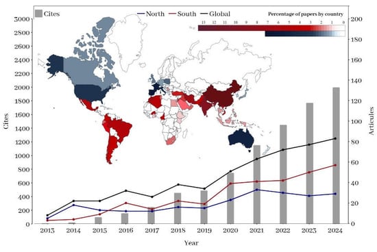 In the last decade, scientific productivity in terms of EnCs has grown, as shown in Figure 2, which details the global evolution of this field from January 2013 to August 2024, with 531 reviewed articles. Between 2013 and 2015, the Global North (GN) dominated publication, with 36 of the 52 articles; however, since 2016, the GS has significantly increased its participation in this area. Between 2016 and 2019, the Global South region showed an average growth rate of 19 articles per year, compared with 14 articles from Global North countries. By the end of 2019, cumulative production was 91 items for both regions, indicating equal total production.