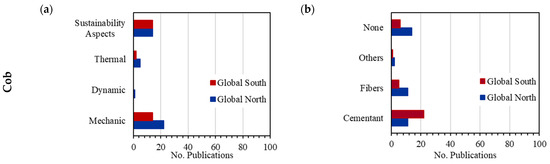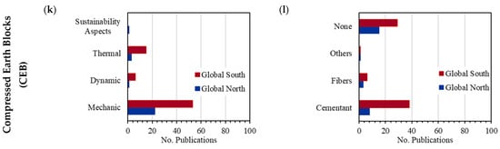 On the other hand, Figure 3k,l show that the GS countries are much more interested than northern countries in studying CEBs. This contrasts with the previously mentioned finding because, despite being more studied in these countries, some Global South countries tend to research other EnCs, such as REWs. This may be because this technique is the most current and has attracted more interest in its study in the context of a developing search for environmental construction alternatives. From this perspective, research on this EnC has focused more on evaluating the mechanical and thermal properties of the material [103,104,105,106], mainly focusing on evaluating the strength of the material with and without additives. From this perspective, the most studied additives are cement [68], lime [107], calcined clay-based alkalis [108], glass powder [109], red clay [110], bentonite [111], kaolinite [112], rice husk ash [112,113], calcium oxide aluminate [16], metakaolin [112], fly ash [19], phosphogypsum [110], blast furnace ash [114], CDW [115] and calcium carbide [116]. Despite this trend, many investigations focused on analyzing the material properties without additions to the structure, focusing on mechanical and dynamic behavior, were also found. On the other hand, few studies with CEBs have included fibers such as sawdust [69], bamboo [117], pig hair [118], polypropylene fibers [119], banana [22], sisal [120], and hemp [121], which have shown promising results in improving flexural strength. Finally, in the classification of “other” additives, there are those that do not fall into the categories of fibers or cementitious agents, such as oil shale [103], steel bars [122], and geogrids [123].