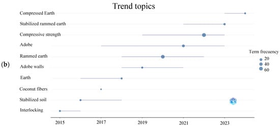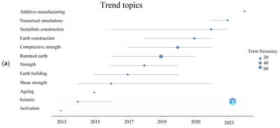 Figure 5 presents a detailed overview of trends in the EnC research over the last decade. In the Global North (Figure 5a), between 2013 and 2015, the topics “activation”, “seismic”, and “aging” show a temporary increase in the frequency of publications, although without establishing a lasting trend. Between 2014 and 2022, “shear strength” remained a relevant topic, with a notable peak in 2016 related to advances in techniques for evaluating the strength of materials in earth structures in response to growing interest in improving safety in seismic construction [52]. Other themes, such as “Strength”, “Rammed Earth,” and “Compressive strength”, also show significant peaks in 2018, 2019, and 2020, respectively, reflecting a trend in the research on the structural behavior of this type of building [136]. Finally, in 2022 and 2023, the topics of “Sustainable construction” and “Numerical simulations” gained relevance, marking a more environmental approach and a transition toward more detailed structural modeling based on the experimental results of previous years [137].