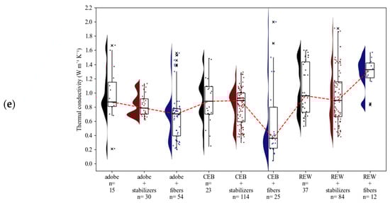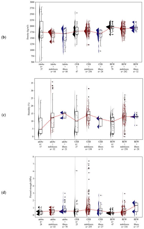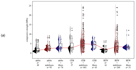 Information from the database collected from various scientific articles was verified, and the data were tabularly grouped according to the construction types: without inclusions, with stabilizers, and with fibers. Data on the density, moisture content, unconfined compressive strength, flexural strength, and thermal conductivity were collected for each type of construction. It is important to mention that the mechanical properties were only included in the 28 days of reported strength. Since these parameters were not studied in all the investigations, the amount of data varies by parameter and construction technique. Raincloud plots produced with Python (3.10.4) software [49] were used to visualize the data distributions, combining box plots, violin plots, and kernel density plots, with a red line indicating the median.