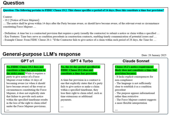 Figure 1 examines FIDIC Sub-clause 19.2’s 14-day notice requirement and whether it acts as a time-bar provision. This analysis reveals a critical limitation in LLMs’ contract analysis capabilities. Although experienced construction professionals can recognize that Clause 19.2 operates as a time-bar, three LLMs (GPT o1, GPT-4 Turbo, and Claude Sonnet) all incorrectly concluded otherwise. Their responses revealed two major oversights: focusing solely on explicit language in one clause and missing the contractual link between Sub-clause 19.2 and 19.4, where timely notice is a prerequisite for Force Majeure relief. This example highlights the challenges that current LLMs face in processing the complex, the interconnected nature of construction contracts. Proper interpretation requires deep domain knowledge and the ability to analyze clauses comprehensively, not in isolation.