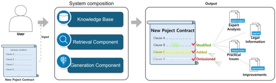 The system’s core functionality comprises three main components, as illustrated in Figure 2. First, the knowledge base contained structured information required for contract review. It stored SCF information and organized expert knowledge, mapping clauses to relevant expert analyses, legal information, and practical considerations. This structured repository provided a clear framework for analyzing various types of construction contracts.
