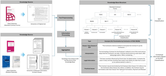 Figure 3 illustrates the process of integrating knowledge into the SCF classification within the knowledge base. The workflow encompassed data collection from both SCFs and related guidebooks, highlighting the extraction of relevant information for each clause. Text preprocessing and information processing stages prepared the data by cleaning and standardizing it. The aggregation stage consolidated this information, aligning it with the knowledge base structure through the SCF classification. This classification ensured that each clause is precisely categorized and linked, facilitating comprehensive contextual analysis that considers the context of each clause. By employing the SCF classification, the system systematically organized contract clauses, ensuring that each clause is accurately mapped to its corresponding knowledge.