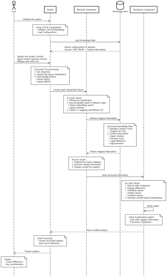 Figure 4 illustrates the sequence diagram of the proposed method, detailing the interactions between the system components during the contract analysis process. The process begins with the user submitting an input contract to the system. The System Controller received the contract and orchestrated the analysis by coordinating with the Retrieval Component. The Retrieval Component classified the input contract clauses based on the SCF classification to narrow down relevant sections. It then performs a hybrid retrieval using both dense vector embeddings and sparse keyword-based searches to fetch pertinent information from the knowledge base.