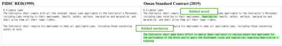 While maintaining a similar structure and conditions to FIDIC Red Book 1999, Oman’s contract includes modifications to reflect local laws and policies, practical requirements, and adjustments to reduce employer’s contractual risks. These modifications include additions or deletions of clauses and changes in sentences, phrases, or terms. Figure 5 illustrates a simple example showing the differences between the FIDIC Red Book and Oman contract, where added conditions in Oman contract are highlighted in green. In the [Labor Laws] clause, Oman’s contract adds conditions for Omanization requirements, stating that the Contractor shall make every effort to employ Omani nationals. Conversely, as an example of deletion, in the [Employer’s Claim] clause, certain conditions regarding claim substantiation and determination procedures were removed.