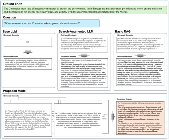 Figure 6 illustrates the comparative analysis of responses to “What measures must the Contractor take to protect the environment?” across different models. The Base LLM offered only general environmental protection practices without addressing specific contractual requirements. It missed critical obligations like taking “all necessary measures,” limiting pollution and noise damage, controlling emissions, and complying with the environmental impact statement.