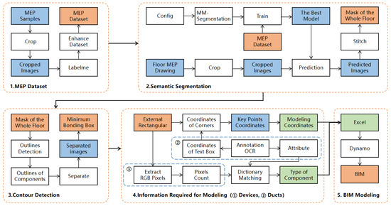 - Semantic segmentation is used to identify MEP components in the drawings and extract their semantic information, with a custom-made MEP dataset used to train the neural network beforehand;