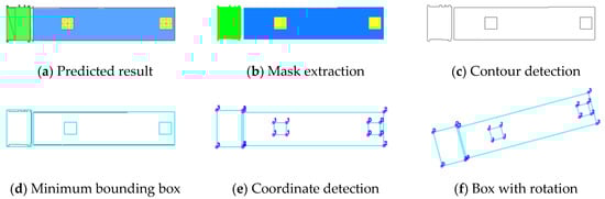 After the mask image undergoes contour detection, the ‘cv2.findContours’ function is utilized to find all the contours and their hierarchical structures in the binary image. Set ‘cv2.RETR_TREE’ to obtain the complete hierarchical structure of the contours. Traverse each of the found contours, and use the ‘cv2.minAreaRect’ function to calculate the minimum bounding box for each contour. When the bounding box is generated, it surrounds the contour by rotation to obtain the bounding box with the minimum area. Finally, use ‘cv2.boxPoints’ to extract the vertex coordinates of these bounding boxes. Traverse all the contours, and, at the same time, define a ‘contour_id’ to assign a unique ID to each contour. Then, use ‘pandas’ to write the contour ID and its corresponding corner point coordinates into an Excel file, so as to facilitate the subsequent processing and analysis of the data. The detailed procedure is depicted in Figure 7.