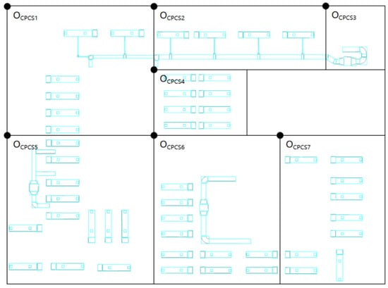 Due to the current limitations of computer and algorithm performance, errors may occur in the results obtained when performing the minimum bounding box detection on the overall contour image of the floor. Therefore, it is necessary to crop the overall contour image to reduce the number of closed curves in a single cropped image and improve the accuracy of the minimum bounding box detection. At this time, during the cropping process, an appropriate window size can be selected according to the size, position, and other conditions of the contour lines, and the windows do not need to be overlapped. During the cropping process, the pixel coordinates of the origin of each cropped image on the overall image (OCPCSi) are recorded. Figure 8 shows the generation of the minimum bounding boxes after partitioning the overall contour detection image of the floor.