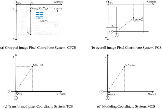 - Establish the MCS (Modeling Coordinate System). Perform proportional transformation to obtain the modeling coordinates Pn(XM, YM). When an image is input during the prediction stage, an image’s pixel length represents an actual engineering length in millimeters. Therefore, it is necessary to divide the pixel coordinate values by the scale to obtain the coordinates with the unit of millimeter, as in Equation (5).