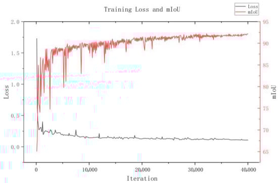 The mIoU increases significantly to 91% within the first 20,000 iterations, indicating that the network’s performance in the semantic segmentation task has improved significantly and it can quickly and accurately identify the target areas. During the subsequent 20,000th to 30,000th iterations, it rises slowly to 92%. From the 30,000th to 40,000th iteration, it remains around 92%, and the fluctuations tend to be gentle. This shows that, although the network has already achieved relatively high performance, it continues to learn and fine-tune its predictions to further improve its accuracy.