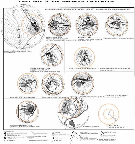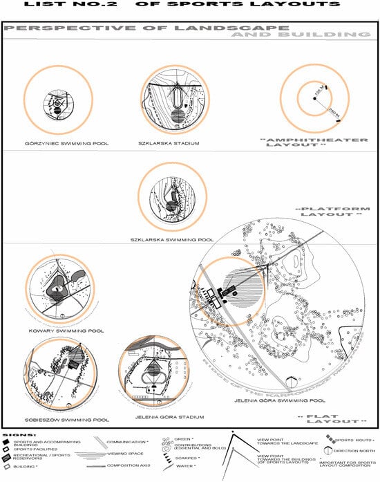1]. Urban and architectural analysis (i.e., analysis of the functions and features of buildings and land development) serves as the basis for administrative decisions. In particular, it concerned the layout of buildings, sports facilities, and accompanying buildings, as well as their communication. The urban and architectural analysis was supplemented with an analysis of compositional elements which occur in sports layouts and, at the same time, are characteristic of palace and park layouts at the foot of the Karkonosze Mountains. The compositional analysis concerned the open space, compositional axes, viewpoints, terrain configuration, and the organization of greenery. The analyses were preceded by the designation of the analyzed area (i.e., the area whose functions of buildings and development were analyzed in order to characterize the existing development). The boundaries of the analyzed area were marked on a topographic map on a scale of 1:10,000, in the 1965 coordinate system, considering a distance no less than the distance to neighboring buildings and in the zone of occurrence of the components of the sports complex. If the sports facility was separated from the neighboring buildings, making it impossible to determine the functional and spatial relations between them, the analysis was carried out in an area with a minimum radius of 125 m. This is an approximate minimum analytical distance in the case of sports layouts, in which the existing neighboring buildings can be considered as a significant compositional factor. The largest sports layouts covered an area with a radius of approximately 250 m or larger.