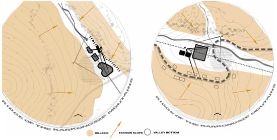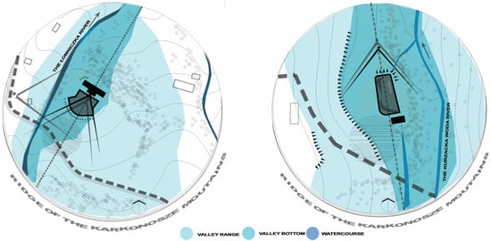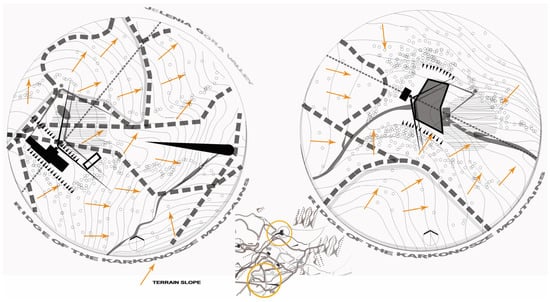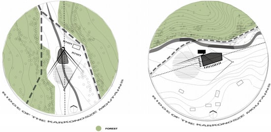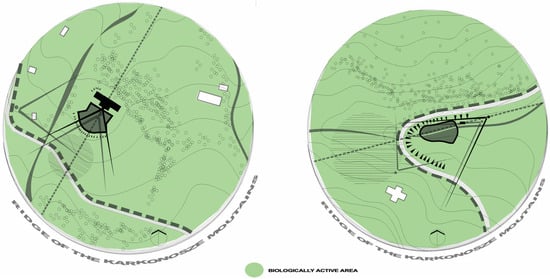 11]. Changing the landscape through the introduction of buildings leaves a mark. Initially, in such circumstances, it becomes an exemplary complement to the natural world, until it exceeds certain, difficult-to-specify boundaries. Mountain areas are among the regions distinguished by the beauty of nature, the landscape, and cultural values, including the Karkonosze Mountains, as a unique geomorphic structure in Central Europe. The highest mountain, massif, in the Sudeten Mountains, is visited by tourists all year round, and such tourist traffic has instigated construction activity. The area is exposed to uneven, immoderate, and unsustainable urbanization. The extreme development of the tourism industry impacted the Karkonosze Mountains in the 1920s and 1930s, then in the second half of the 20th century, and again in the first half of the 21st century. In the first period of mass tourism—and even during the second one—architectural layouts were created that were characterized by moderate interference with the natural environment while increasing the quality of local capital. These structures were sports investments, built during the post-war crisis (i.e., after World War I and World War II). The microclimate of the Karkonosze Mountains was perfect for winter sports enthusiasts (which, at that time, was in the blooming phase). Sports facilities in the Karkonosze Mountains are an example that can serve as an inspiration to solve real problems through sustainable architecture principles.