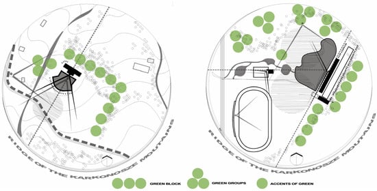 Adapting greenery to connect sports facilities with their surroundings on both a micro- and macro-scale (inviting greenery and framing views as part of larger forest and park areas) and, to the contrary, to isolate sports interiors while achieving the effect of transparency and spaciousness (peripheral greenery with view clearances). In particular, in the Karkonosze Mountains in Cieplice or Kowary, greenery played a role in effectively separating sectors characterized by various activities (