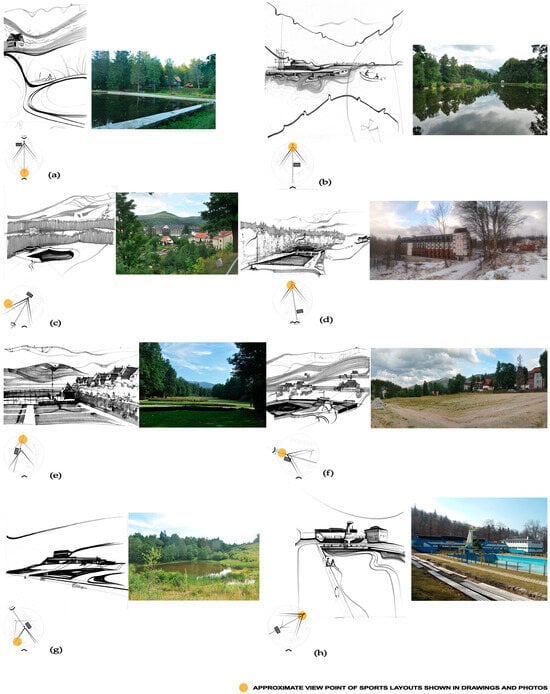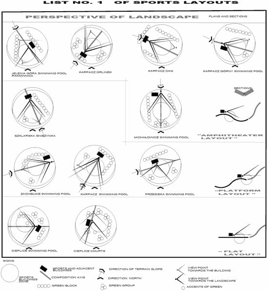 The sports facilities (sports layouts) that are the subject of research were created, as mentioned above, in the 20th century. They arose as a result of the popularization of physical education, the hygiene movement, and the bath culture that swept Europe in modern times at the end of the 18th century. In the part of Europe where the Karkonosze Mountains and the associated sports facilities are located, green areas were initially the background for sports activities. The natural predispositions of the area were used for sports purposes (e.g., river and seaside bathing areas and ice rinks on water bodies). At the beginning of the 20th century, the concept of the park (promoted as a “People’s park”) came even closer to the needs of athletes (e.g., simplification of the path system, zoning for sports equipment, and the creation of multi-functional clearings). Since the 1920s, sports parks have been created for active leisure and professional sports practice. Simultaneously with the creation of parks, the first independent sports facilities were built. In subsequent years, the sports layouts—in more or less formalized form—were always accompanied by greenery. In the second half of the 20th century, sports grounds were perceived as an antidote to unhygienic working conditions and poor housing conditions. Attention was drawn to the obvious role of the landscape, greenery, and composition in the design and planning of sports areas [