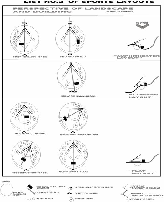 The sports layouts were subjected to compositional, urban, and architectural analysis, taking land development and architectural form into account. The scope of the urban and architectural analysis was determined on the basis of Polish legislation (e.g., the Act of 27 March 2003 on spatial planning and development), among others [