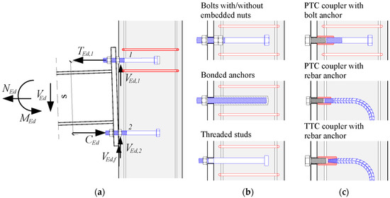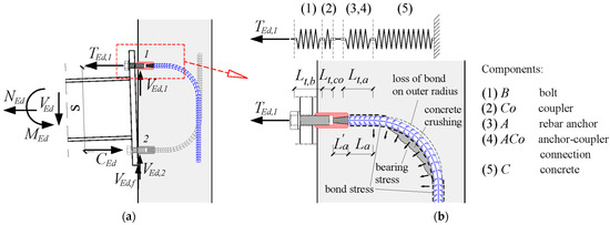 The performance of a steel-concrete structure highly depends on the performance of joints and connections between steel and concrete elements. The behavior of steel-concrete joints can have a significant effect on the distribution of internal forces and moments within the structure, as well as on the overall deformations of the structure. In general, joints can be classified as simple (pinned), continuous, or semi-continuous [5]. The performance of the joint can be evaluated through its resistance, rotational stiffness, and rotation capacity. The analysis of the overall behavior of steel-concrete joints and connections can be conducted via the component method [6,7], which is primarily used for the joint analysis in steel structures [8,9]. In order to predict the global resistance and deformability of joints and connections under arbitrary loads, the resistance and deformability of each component have to be determined (see Figure 1a). The “weakest” component mostly governs the behavior of the connection as a whole. Steel element transfers bending moment, shear, and axial forces to RC element as shear and axial loads acting on connectors. In the analysis of connectors, the key challenge is to define their behavior under pure shear load and pure tension load as well as under their combined action.