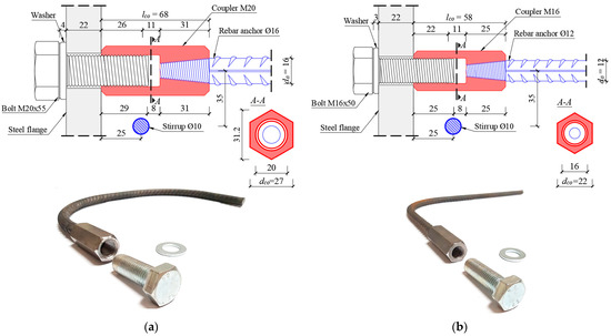 The layout of tested demountable connectors with mechanical coupler and rebar anchor: (a) connector with M20 bolt and 16 mm rebar anchor, and (b) connector with M16 bolt and 12 mm rebar anchor.
