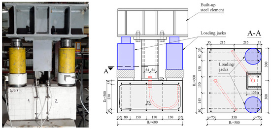 Following the specimen assembly, two loading jacks were placed between the RC element and the steel element, as shown in Figure 4. Loading jacks were placed symmetrically in relation to the connector axis, at the centroidal distance of 225 mm. In this way, the tension load was applied centrically on the connection. Two loading cells were placed at the bottom of loading jacks in order to continually measure the applied tension load. Loading cells were supported by two steel plates with 20 mm thickness. At the top of the loading jacks, two spherical bearings were placed.