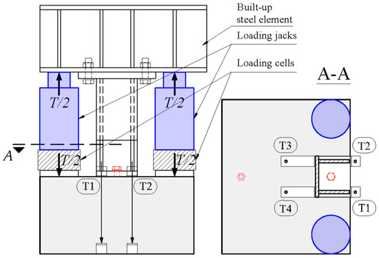 The loading procedure was completed in two phases, similarly to the procedure described in [15,27,28]. In the first phase, monotonic tension load was increased gradually for not less than 20 min, up to the attainment of connector yield strength Ty. On average, this corresponds to an increase in tension load up to 4.5 kN/min (an increase in uplift dT up to 0.05 mm/min). In the second loading phase, the specimen was loaded until the failure for not less than 15 min. The load was applied with 400 kN capacity loading jacks.