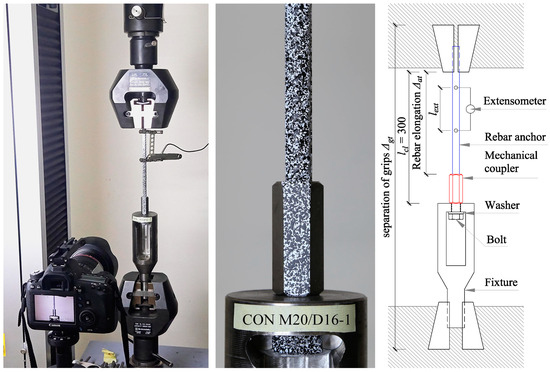 The layout of in-air specimens is presented in Figure 5. Specimens were assembled by connecting the steel fixture to the mechanical coupler with a steel bolt. Specimens with fixtures were placed in the tensile testing machine. The testing machine was provided with high pressure grips that restrain the clamped specimen regions—fixture on one side and rebar anchor on the other side, without permitting any slip. In all cases, specimens had a minimum clear length of rebar anchor lcl = 300 mm. As in push-out tests, bolts were pretensioned with a low level of pretension force.