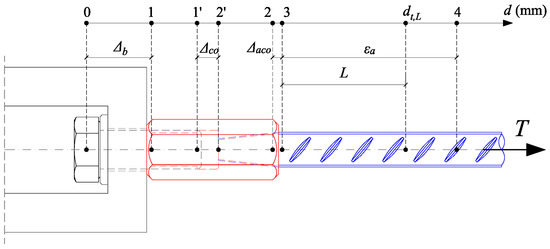 The layout of measurement points and corresponding physical quantities that were measured in in-air tests are presented in Figure 6. The quantities were adopted as the most appropriate for a detailed description of the local behavior of all connector components under tension load. All measured deformations of the connector were based on the difference of connector displacements at points 0–4. The elongation of the rebar anchor and corresponding strains εa were measured based on the available lengths on photographs—90 mm for connectors with M20 bolts and 100 mm for connectors with M16 bolts. The elongation of mechanical couplers Δco was measured at the location of the weakest section (section I-I in Figure 2). The slip between the rebar anchor and mechanical coupler slip Δaco was calculated based on the displacement difference between adjacent points on the rebar and coupler. Bolt elongation Δb was estimated with the neglection of deformation of the bolt head and washer. Lastly, the total elongation of the connectors was assessed based on the displacement dt,L. This point was determined based on the length of the straight part of rebar anchors used for connectors tested in pull-out tests (L = 50 mm for connectors with M20 bolts and L = 110 mm for connectors with M16 bolts, as shown in Figure 2 and Figure 6).