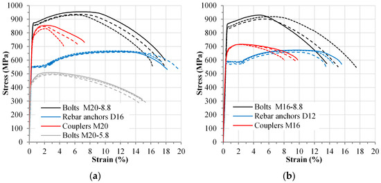 Stress-strain curves for all connector components: (a) components of connectors with M20 bolts, (b) components of connectors with M16 bolts.
