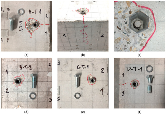 Failure modes and damage of RC elements: (a–c) A-T specimen series, (d) B-T specimen series, (e) C-T specimen series, (f) D-T specimen series with M20 bolt (grade 5.8).