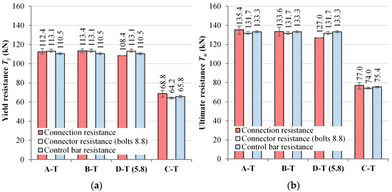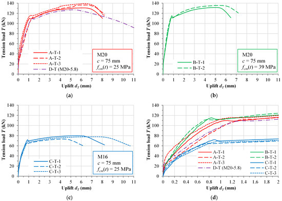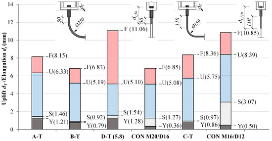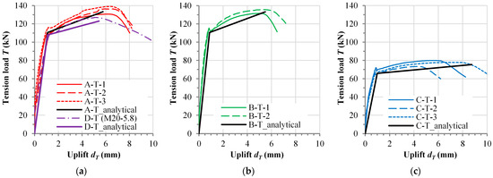 Higher initial stiffness of the connection (see Figure 9d) was the result of a small amount of bolt preload, as stated in Section 2.2.1. After the bolt preloading force was overcome, there was a drop in connection stiffness. Distinctly non-linear behavior of the connection occurred at around 85% of the ultimate resistance. This phase was identified with the yielding load of the connector Ty, i.e., yielding rebar anchor in case of specimens with bolts grade 8.8 and, in case of specimen D-T, yielding of bolt grade 5.8. The steel-concrete uplift in this phase was between 0.6 and 1.4 mm. The failure of all specimens occurred at the uplift not less than 6.5 mm. Specimens in series B-T had the lowest deformability due to the highest concrete strength, while specimen D-T had the highest deformability, primarily due to bolt failure.