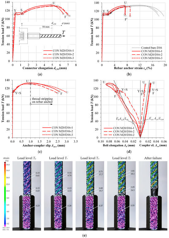 The main parameters describing the specimen behavior under tension load (i.e., tension load T, elongation of the connector dt, and slip between rebar anchor and mechanical coupler Δaco) at different loading phases are presented in Table 5. Statistical evaluation of test results was performed according to recommendations given in EN 1990: 2002, Annex D [30].