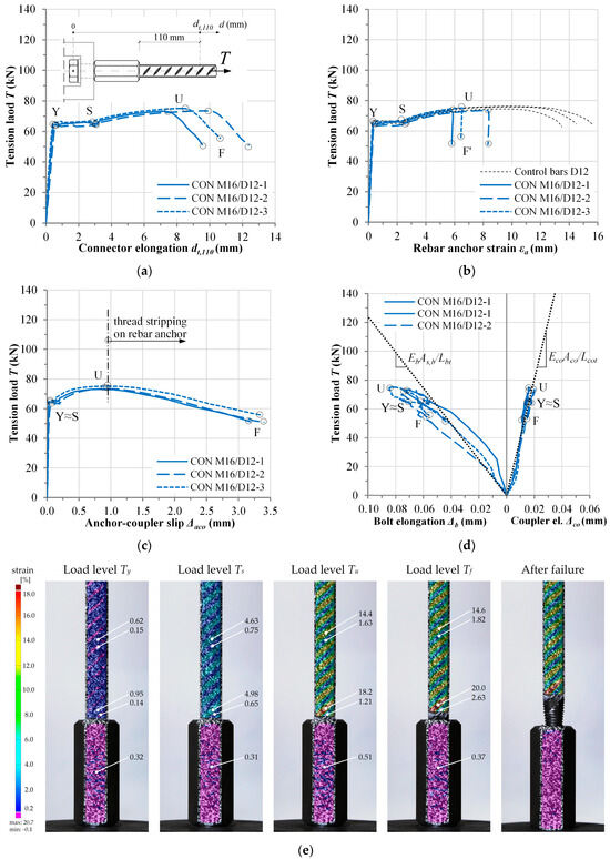The global behavior of the connectors under tension load was similar for both specimen series. The behavior of the rebar anchor was governing the behavior of the connector as a whole, which can be explained with significantly higher strains in the rebar anchor compared to the strain in the mechanical coupler, as shown in Figure 11e and Figure 12e. Therefore, four characteristic loading phases for describing connector behavior can be defined: “Y”—onset of rebar anchor yielding, “S”—onset of rebar anchor strain hardening, “U”—ultimate resistance of rebar anchor (connector), and “F”—failure of the connector.