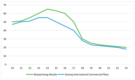 By comparison, we can find that the mean radiant temperature (MRT) value of the external space of Daning International Commercial Plaza is lower than that of Wujiaochang Wanda Plaza, with the maximum difference occurring between 14:00 and 15:00 (Figure 7).
