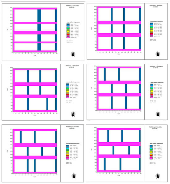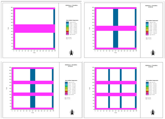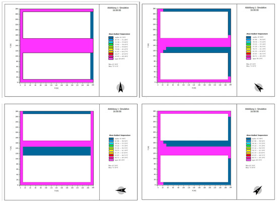Numerical comparison of MRT (°C) in the outer space of prototype model 3000-30-45 (10:00–23:00, 1.2 m above ground)—drawn by the author.