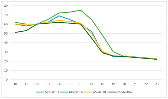 Figure 23 presents a numerical comparison of MRT values in the outer space from prototype model 101 to model 104, spanning from 10:00 to 23:00. Upon comparison, it is evident that the overall trend of MRT between the two models is similar. However, the MRT value of the optimized model 207 is significantly lower than that of the prototype model.