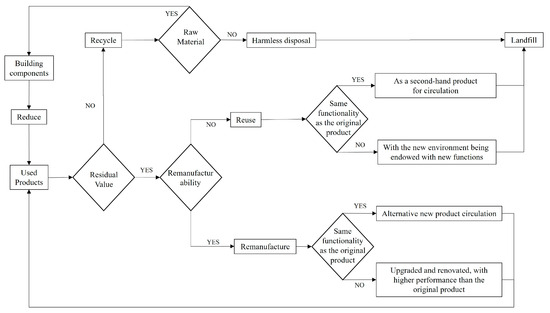 In the construction industry, renovation is a common way to extend the lifespan of buildings, usually by only carrying out partial repairs rather than complete demolition and reconstruction, and the product may not necessarily enter the material cycle. As an advanced practice of circular economy, there are significant differences between remanufacturing and other modes of “3R” (reduce, reuse, and recycle), and understanding these differences is the key to promoting remanufacturing. Figure 1 illustrates their differences in the form of a flowchart.