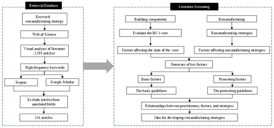 Next, the captured publications will be screened out. Research that does not include the term ‘construction’ in its abstract will not be automatically excluded. Compared to other industrial strategies, the current degree of remanufacturing in the construction industry is quite low, with opportunities for learning and experience. However, the abstract of a publication must include at least one of the following words: ‘architecture’, ‘building components’, ‘strategy’, ‘decision-making’, ‘circular economy’, ‘factors’, ‘strategy’, or ‘framework’, and ‘remanufacturing/remanufacturing’. Finally, do a text review; publications that include these words but do not focus on remanufacturing strategies have been rejected.