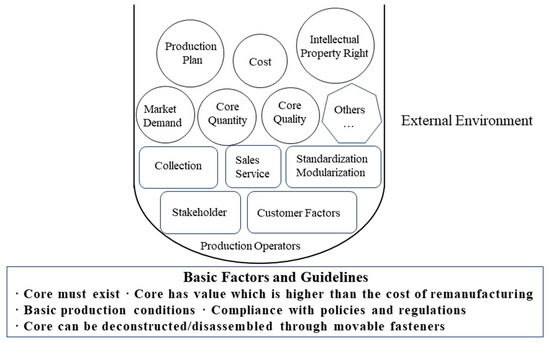 Basic remanufacturing rules can be formed by comprehending the literature, analyzing the current environment of the remanufacturing process, and investigating the link between its primary components. Value factors are critical for the successful implementation of remanufacturing. As described in Section 4.1, the value of remanufacturing is influenced by two fundamental factors that determine the core’s status: its availability or supply and its residual functionality or performance.