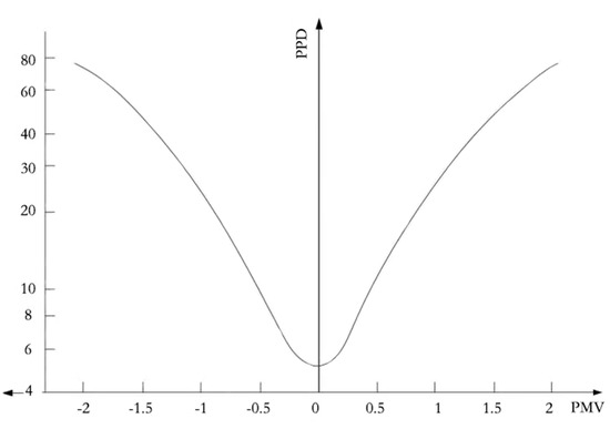 Because of individual differences, it is impossible for the PMV model to evaluate a thermal environment accurately. Professor Fanger proposed another measure—PPD (predicted percentage dissatisfied). This indicator predicts respondents’ evaluation of a thermal environment by calculating their dissatisfaction with the thermal environment. The relationship between PMV and PPD is shown as follows: