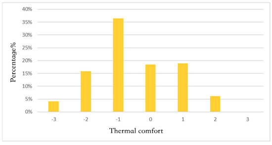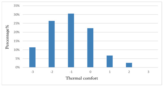As shown in Figure 2, when the indoor thermal environment has been in the most ideal comfort state, the PMV is 0, and 5% of respondents are dissatisfied with the thermal environment. According to the ISO 7730 standard, when 10% of respondents are dissatisfied with the thermal environment, 90% of participants consider that it is a comfortable thermal environment, and the PMV is between −0.5 and 0.5. According to the Evaluation Standard for Indoor Thermal Environment in Civil Buildings (GB/T 50785-2012) [28], as the voting value of PMV ranges from −1 to 1, about 75% of participants are satisfied with this thermal environment.