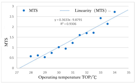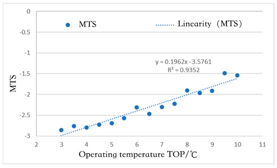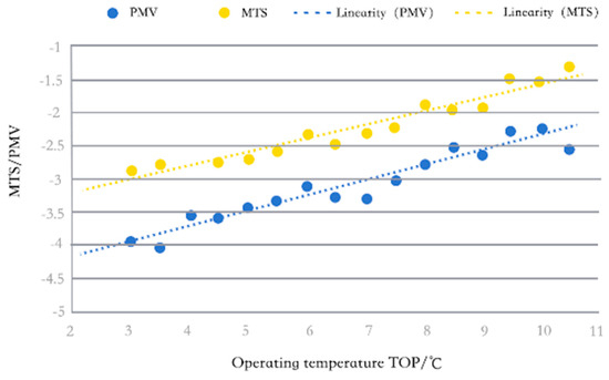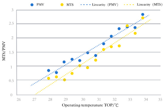 In order to improve the accuracy of the data analysis, the temperature frequency method was used to process the data collected from the field investigations and questionnaires. The indoor operating temperature (TOP) was divided into several intervals every 0.5 °C. The average operating temperature in various intervals was taken as the independent variable, while the values of MTS and PMV in the intervals were taken as the dependent variables to obtain MTS-TOP and PMV-TOP models by linear regression analysis.