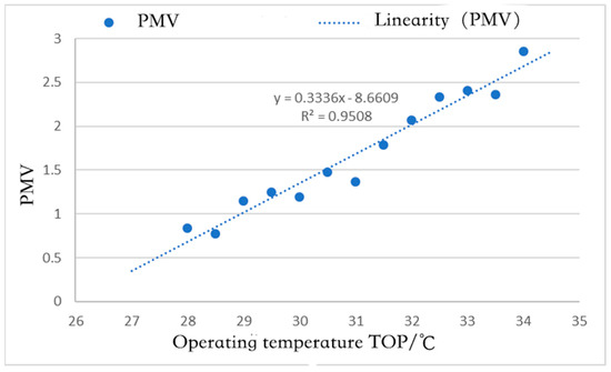 The models of the relationship between the PMV and TOP of indoor respondents in rural houses in Xuzhou in summer and winter are shown in Figure 7 and Figure 8, respectively.