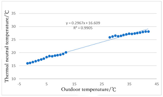 Compared with the PMV model, the MTS model considers the respondents’ adaptability to the local climate more. In order to analyze the thermal sensation of rural residents in Xuzhou more comprehensively and accurately, the MTS model was selected to construct the adaptive thermal comfort model. The method was as follows: the outdoor temperature TO was divided into several intervals of 1 °C. The temperature frequency method was used to analyze the MTS values collected from the thermal comfort questionnaires and the indoor environmental parameter TOP values obtained from the field test within each interval of 1 °C, and the thermal neutral temperature Tn in each interval of 1 °C was calculated. The adaptive thermal comfort model of rural residents in Xuzhou was constructed by combining the thermal neutral temperature Tn and outdoor temperature TO in each interval of 1 °C. The thermal neutral temperature Tn refers to a specific state, in which the human body neither feels cold nor overheated, thus achieving a comfortable optimal state. The human body requires the least energy to regulate its temperature in a thermally neutral state. Figure 11 shows the simultaneous distribution of winter and summer thermal neutral temperature Tn and outdoor temperature To for rural houses in the interval of 1 °C, and the equation of the adaptive thermal comfort model is as follows: